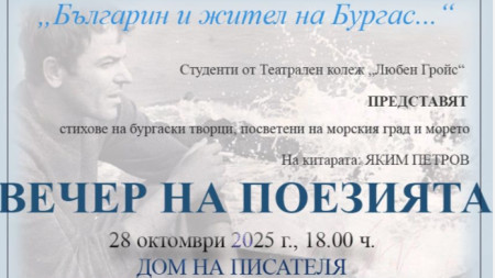 Празник на поезията предстои днес в Дома на писателя в Бургас. Той е част от Есенните литературни празници. Събитието ще е под мотото „Българин и жител на Бургас“, съобщи организаторът му Диана Фъртунова: "Избрахме това мото със Светла Гунчева, която ми помага с организацията, за да отдадем почит на големия Христо Фотев. Решихме, че..
