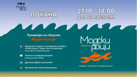Учредителите на клуба за хумор и сатира „Морски раци“ към Сдружение „Бургаска писателска общност“ канят бургазлии на премиерата на сборника „Морски раци“. Представянето ще се състои на 27 октомври от 18:00 ч. в Дома на писателя под режисурата на Румен Велев. Събитието е част от програмата от Есенните литературни празници в Бургас. Организатор на..