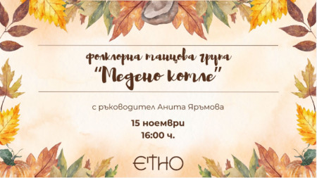 Етно кафене и музей ще се изпълни с ритми и настроение на 15 ноември от 16:00 ч., когато сцената ще посрещне Фолклорна танцова група "Медено котле" с ръководител Анита Яръмова. Входът за концерта е свободен. Формацията е създадена през 2015 г. от Анита Яръмова – художествен ръководител и хореограф. Вече десет години обединява самодейци от различни..