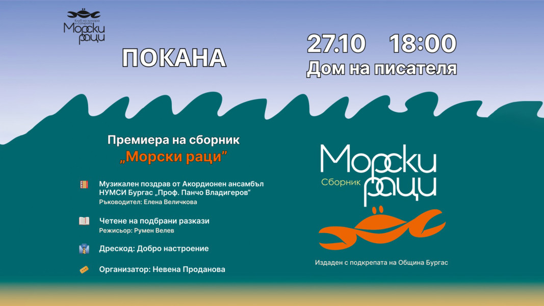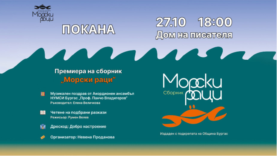 Учредителите на клуба за хумор и сатира „Морски раци“ към Сдружение „Бургаска писателска общност“ канят бургазлии на премиерата на сборника „Морски раци“. Представянето ще се състои на 27 октомври от 18:00 ч. в Дома на писателя под режисурата на Румен Велев. Събитието е част от програмата от Есенните литературни празници в Бургас.