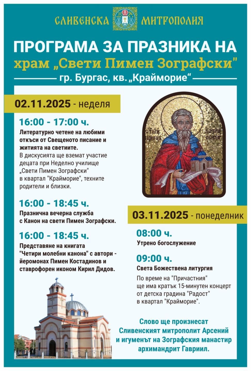 С редица събития отбелязват празника на храм "Свети Пимен Зографски" в бургаския квартал "Крайморие". Православната църква почита светеца на 3-ти ноември.