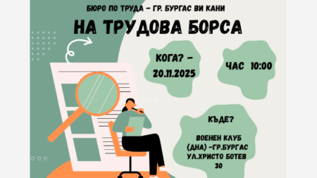 ПОВЕЧЕ В ЗВУКОВИЯ ФАЙЛ:Дирекция „Бюро по труда“ – Бургас организира обща трудова борса с участието на около 20 работодатели от различни икономически сектори. Събитието ще се проведе на 20 ноември от 10:00 часа във Военния клуб в Бургас. Инициативата се осъществява съвместно с Изпълнителна агенция „Военни клубове и военно-почивно дело“, Сдружение „Нов път“ и организацията..