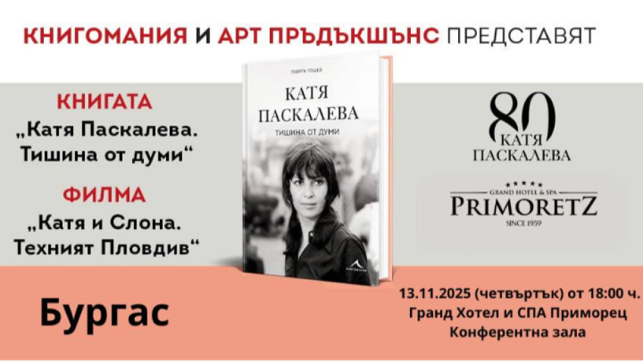 Журналистът Георги Тошев ще представи книгата си "Тишина от думи" и филма „Катя и Слона. Техният Пловдив“, посветени на 80-годишнината от рождението на великата актриса. Срещата с него ще е на Гранд хотел и Спа Приморец.