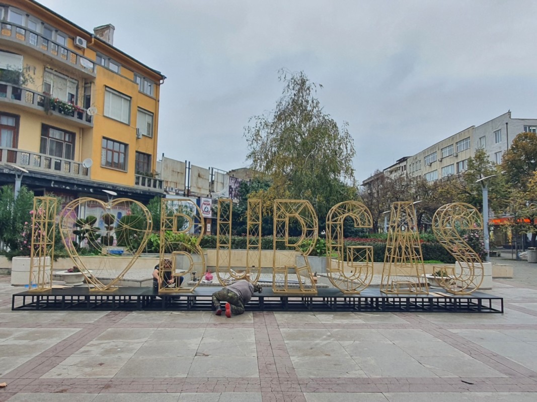 Надпис „I ❤️ BURGAS“ ще грейне до дни на централния площад „Атанас Сиреков“. В момента той се монтира, информират от общината.