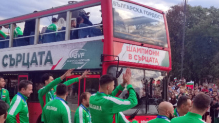 Les volleyeurs ont fait un tour de Sofia en champions, à bord d'un bus à imperiale, avant d'arriver devant la cathédrale "Saint Alexandre Nevski" où la foule les a accueillis avec des ovations tonitruantes.