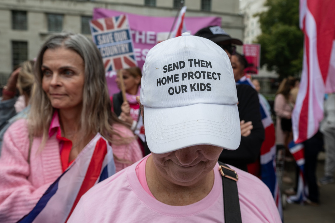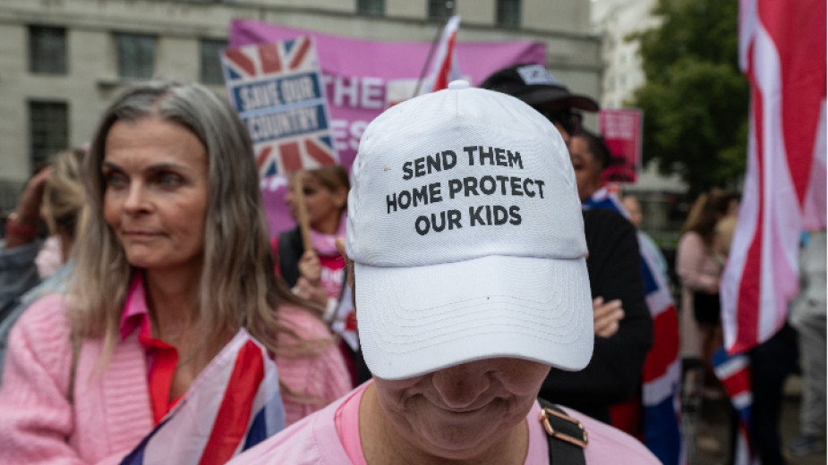 Участничка в протест във Великобритания носи шапка с надпис: "Изпратете ги вкъщи, защитете децата ни".