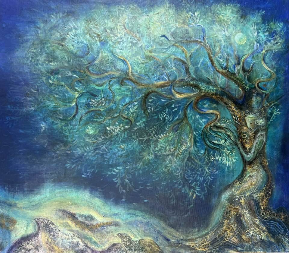 В платната ѝ маслиновото дърво е древен архетип, фигура на памет и пророчество, свързваща земята и духа, болката и светлината. Със специална авторска техника, комбинираща релеф и живопис, Достена изгражда и визуални тотеми на четирите елемента - Въздух, Огън, Вода, Земя - обединени от тайнствения пети елемент, онова непознаваемо, което пулсира отвъд границите на разума.