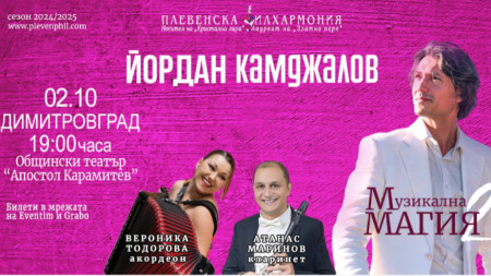 Плевенската филхармония под диригентството на маестро Йордан Камджалов ще представи днес в Драматичния театър "Апостол Карамитев" в Димитровград от 19 ч. концерт от Националното турне "Музикална магия 2". В програмата са включени произведения от Чайковски, Щраус, Брамс, Бизе, Сарасате, Монти, Сен-Санс, Дворжак, Паганини, Пиацола и други. На сцената ще..