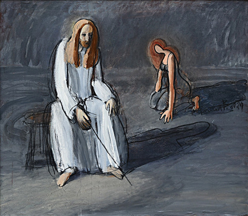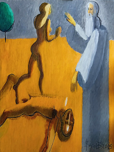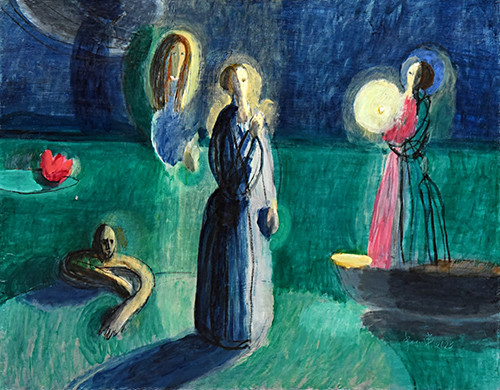 Тази двойственост е в цялата изложба – в цикъла "Христос и блудницата“, в картините "Мъж със свещ отива при жена“, "Извор на една много дълга река“, "Ангел полива лилия“, "Жена с фенер в лодка“ , "Светещ кръст, ангел и жълта роза“ ... Но тя е в изкуството изобщо. Библейското и еротичното се преплитат в толкова човешкия стремеж за сливане с другия; телесното и духовното са лицата на един живот, личност, на съществуването изобщо. Еротиката е изкушение, но и откровение - тялото, което говори и свидетелства за живот. Светлината тук е не само символ на вярата – тя е покана, разкриване, еротичен жест.