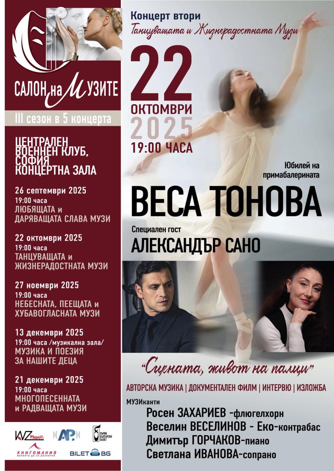 Публиката ще види “Сцената и живот на палци” – портрет на Веса Тонова, с примабалерината ще разговаря Александър Сано, ще участват и музикантите Росен Захариев, Веселин Веселинов - Еко и Димитър Горчаков. А Светлана Иванова ще се включи с арии от своя репертоар.