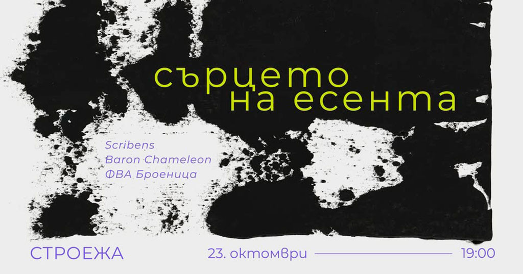 На "най-голямото поетично-музикално събитие за този сезон!", както го определят организаторите му, ни канят на 23 октомври издателство "Скрибенс" и блус-рок групата Baron Chameleon. "Сърцето на есента: поезия и музика" е заглавието на вечерта, която включва изпълнения от поетите Анастасия Стоева, Анна Лазарова, Антонина Георгиева, Биляна Димова, Валентин Дишев, Георги Гаврилов, Георги Петров, Деница Куртажов, Ева Гочева, Калоян Иванов, Лора Младенова, Маламир Николов, Мария Гетова, Мария Куманова, Мила Люцканова, Нинко Кирилов, Полина Господинова, Светлин Иванов и Христо Мухтанов и от групите Baron Chameleon и ФВА Броеница.