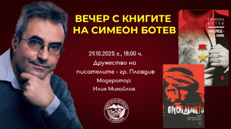 Писателят Симеон Ботев гостува в Пловдив за представяне на неговите книги. Преди дни авторът спечели - втора награда от националния литературния конкурс "Йордан Радичков" на община Берковица, за сборника му с разкази „ Неизбежният наследник “ (ИК Жанет 45). Преподавателят и писател Илия Михайлов ще бъде водещ на разговора със Симеон..