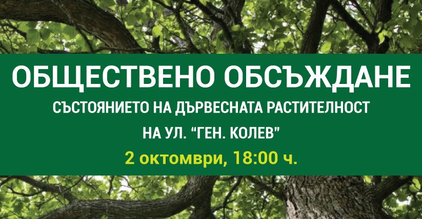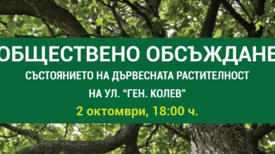 В район „Западен“ в Пловдив тази вечер ще се проведе обществено обсъждане на състоянието на дървесната растителност на ул. „Ген. Колев“. То ще бъде в в залата на районното кметство на ул. „Вечерница” 1А, началото е в 18 часа. Ще присъстват районният кмет Тони Стойчева и екип от ландшафтни архитекти.