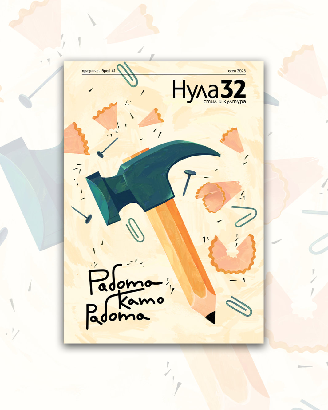 Празничният есенен брой №41 на Нула32 със заглавие „Работа като работа“ е вече факт. В него списанието коментира само себе си: занаята, съмненията, упорството да продължава да излиза без прекъсване вече цяла декада. В броя участват редовни автори и визуални артисти, с които редакцията си сътрудничи през годините, приятели и колеги от други издания, както и дългогодишни партньори. Резултатът е най-колажният брой на Нула32 досега – редакционно пиршество, което събира в едно саморефлексия, метакритически текстове и разнообразни художествени експерименти. Броят вече се разпространява свободно в мрежата на списанието в осем български града.