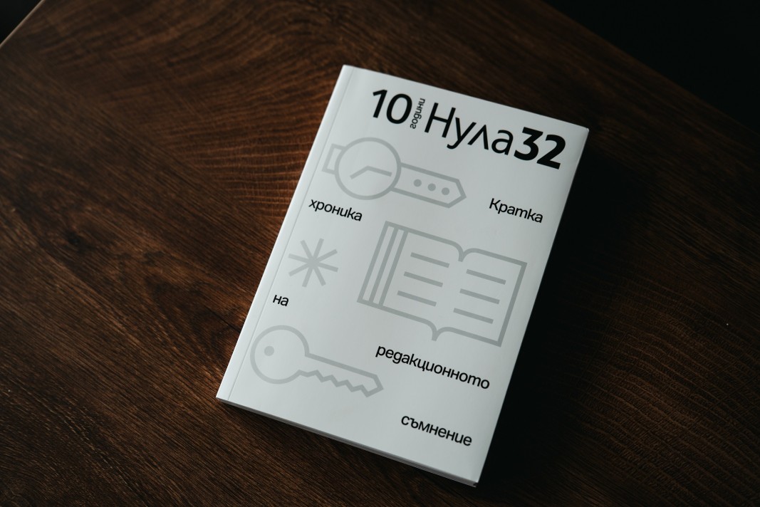 Тази вечер от 18:30 ч. в Politico Speakeasy (ул. „Велико Търново“1, Пловдив)  ще бъде представена юбилейната книга „10 години Нула32. Кратка хроника на редакционното съмнение“. Специалното издание събира в 256 страници 85 текста и над 140 фотографии и илюстрации, които проследяват редакционния път на списанието в периода 2015–2025 г. В контраст с хронологията на редовните броеве, книгата предлага контекст и нов поглед към акцентите, проблемите и взаимодействията, оформили физиономията на сп. Нула32. За книгата ще разговарят редакторите Панайот Стефанов и Илия Димитров, а модератор на премиерата ще бъде Екатерина Илиева. Книгата ще бъде достъпна за закупуване по време на премиерата. Събитието е с вход свободен, резервациите са препоръчителни.