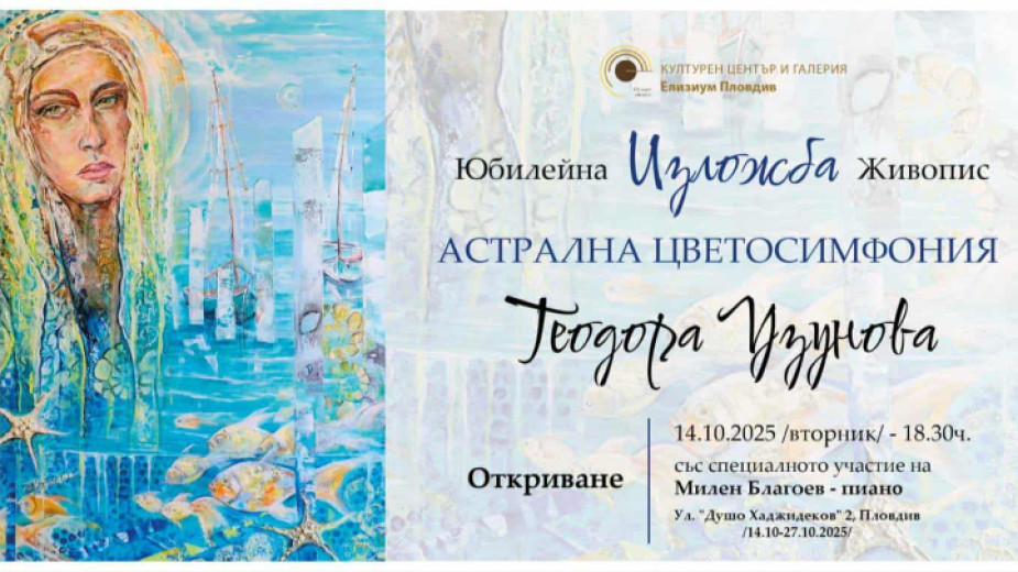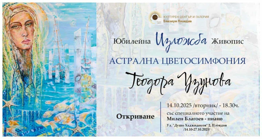 Покана за изложба отправяме в разговор с авторката на картините - Теодора Узунова. „АСТРАЛНА ЦВЕТОСИМФОНИЯ“ е юбилейна самостоятелна изложба на художничката, която от години живее и твори извън родината.