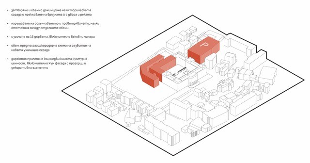 Предложението предвижда трите съседни терена – настоящият двор на гимназията, бившата сграда на ТЕЛК и теренът на някогашното турско училище – могат да бъдат обединени в общ учебен кампус. Така ще се избегне премахването на спортните площадки във вътрешния двор на гимназията, както предвижда общината, за да построи нова сграда за основно училище „Княз Александър I“, посочват внсителите Веселина Александрова, Добромира Костова и Чило Попов.
