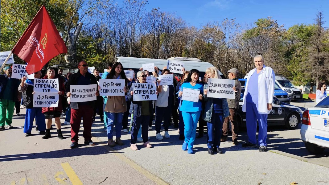 Протестиращите медици от УМБАЛ "Пловдив" отново блокираха по обяд кръстовището на бул. "България" в близост до болницата. Със сирени и викове „Ние сме с вас д-р Генев“ те отново настояха досегашният директор на лечебното заведение д-р Динчо Генев да остане на поста си.