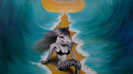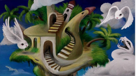 Създаденият от художника свят е красив, цветен, пленителен, но в същото време нещо като че ли ни нашепва да внимаваме какво стои зад привидното спокойствие, за да не се озовем от обратната страна, където човекът може да бъде разчленен и захвърлен на пътя.