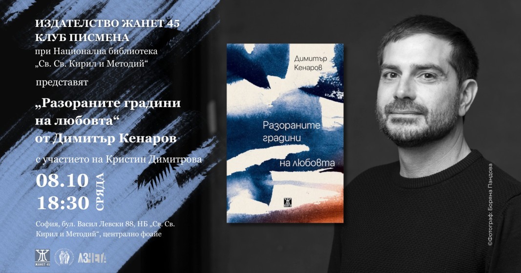 Димитър Кенаров, журналист, преводач и писател представя новата си поетична книга "Разораните градини на любовта" на 8 октомври в 18.30 часа, клуб "Писмена" на Националната библиотека "Св. св. Кирил и Методий".