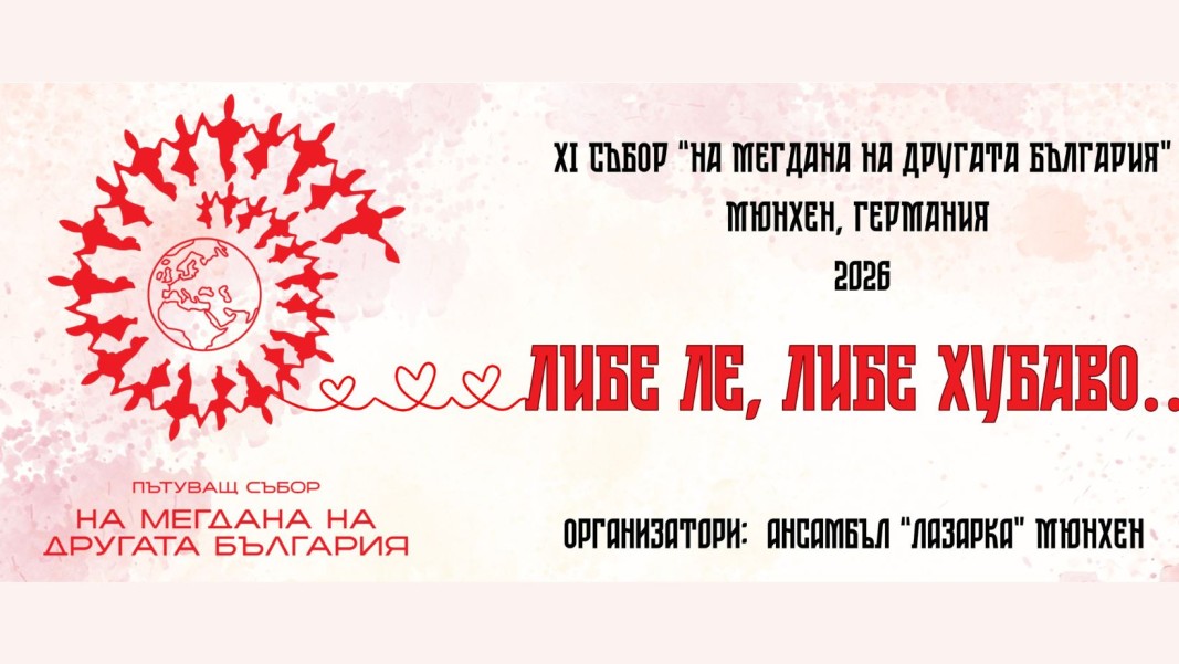 Под знака на любовта, на мегдана в Мюнхен през 2026 година, ще се съберат самодейни изпълнители на български фолклор от близо и далеч. Нашенският фолклорен ансамбъл "Лазарка" ще е домакин на следващото издание на форума "На мегдана на Другата България". Все още не е известна датата на 11-ото му издание, но пък е ясна темата – "Либе ле, Либе хубаво", съобщиха с пост във фейсбук организаторите от Мюнхен: