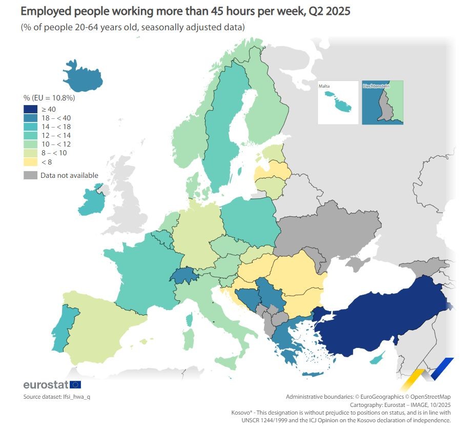 През второто тримесечие на 2025 г. 10,8% от заетите лица на възраст 20-64 години в ЕС са работили повече от 45 часа седмично на основната и втората си работа взети заедно, показват обобщени данни на европейската официална статистика Евростат.