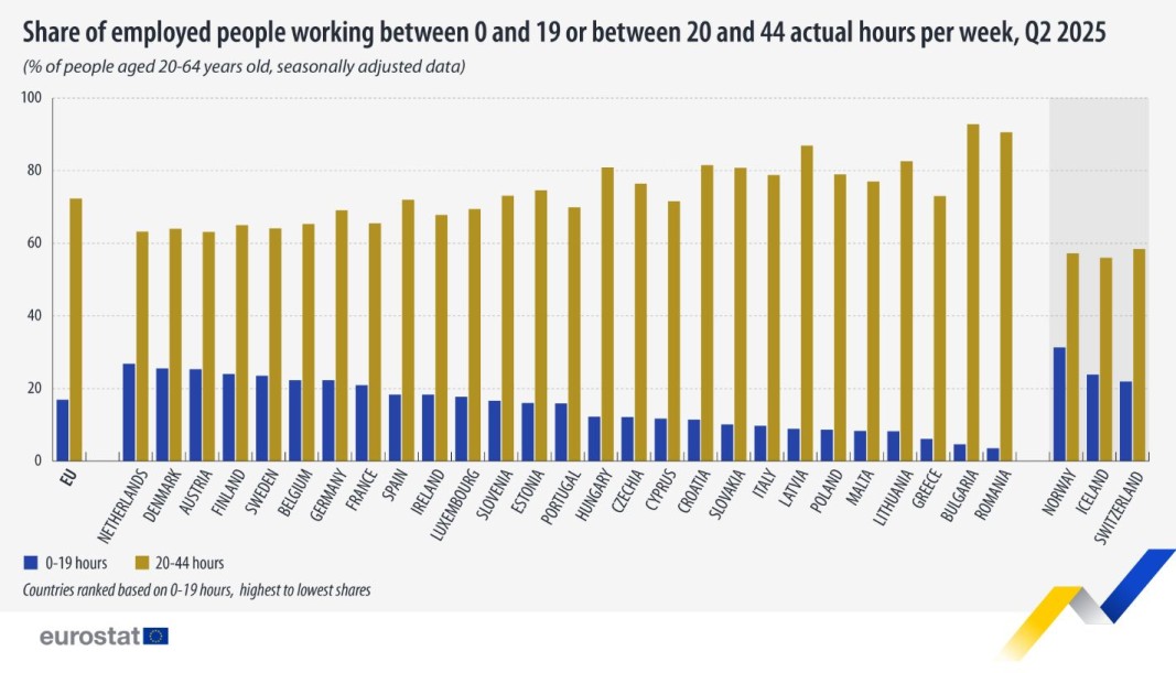 Работното време между 20 и 44 часа седмично (комбиниране на основна и втора работа) е било най-популярно в ЕС, като 72,3% от всички заети лица попадат в тази категория през второто тримесечие на 2025г. показват още данните на Евростат.