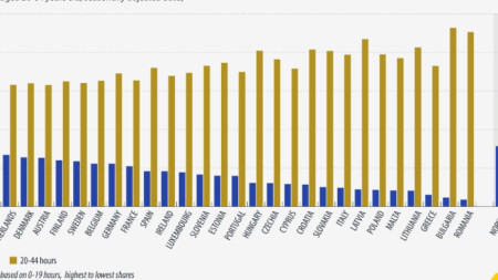 Данните обаче показват забележими разлики между отделните страни от ЕС, като в България едва 2,5% от заетите лица са работили над 45 часа седмично през второто тримесечие. Това отрежда на нашата страна последно място, като тя е следвана от Латвия (с 4,1%) и Румъния (с 5,9%).