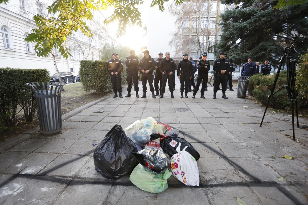 Със скандирания "Мафията вън!" и "Боклуци!", представители на сдружението направиха купчина от черни найлонови чували.