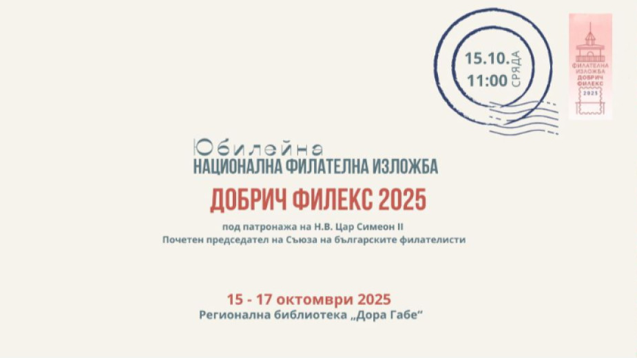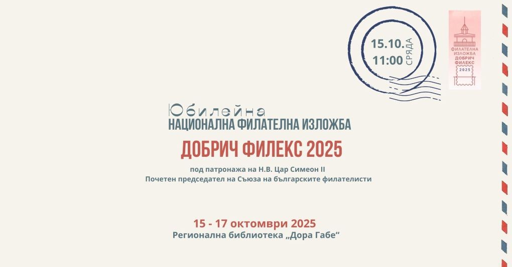 В Регионалната библиотека "Дора Габе" в Добрич, в 11.00 ч., се открива юбилейна филателна изложба "Добрич Филекс 2025". Изложбата е посветена на 85-та годишнина от възвръщането на Южна Добруджа в пределите на България.