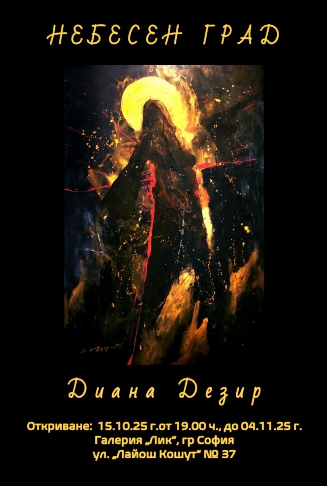 Тази вечер от 19:00 ч. в галерия "Лик" — галерията, която първа показа картините на Диана Дезир — ще бъде открита поредната самостоятелна изложба на художничката. "Небесен град" е наименованието на изложбата. Защо избра точно това заглавие за новата си самостоятелна изложба в галерия "Лик" — ще чуем от интервюто на колежката Нина Цанева с художничката Диана Дезир.