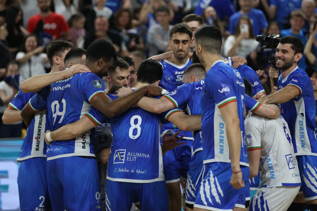 Левски започна по-добре третия гейм с 6:2 и 8:4. Старозагорци намалиха пасива си само до точка при 11:12. При 18:14 за Левски след ас на Лазар Бучков треньорът на "зелените" Мирослав Живков прекъсна играта за наставления. Ас на Тодор Скримов направи резултата 24:17 и стигна до седем мачбола. "Сините" реализираха още първия за 25:17 след контраатака на Вайциг.