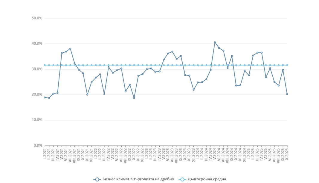 Съставният показател "бизнес климат в търговията на дребно" бележи спад през октомври с цели 9,6 пункта до 20,2% от 29,8% месец по-рано, в резултат на промяна на оценките и очакванията на търговците на дребно за бизнес състоянието на предприятията от "по-добро" към запазване на "същото ниво". Оценките им относно обема на продажбите през последните три месеца се подобряват, докато прогнозите им за следващите три месеца са неблагоприятни, отчита още проучването на НСИ.