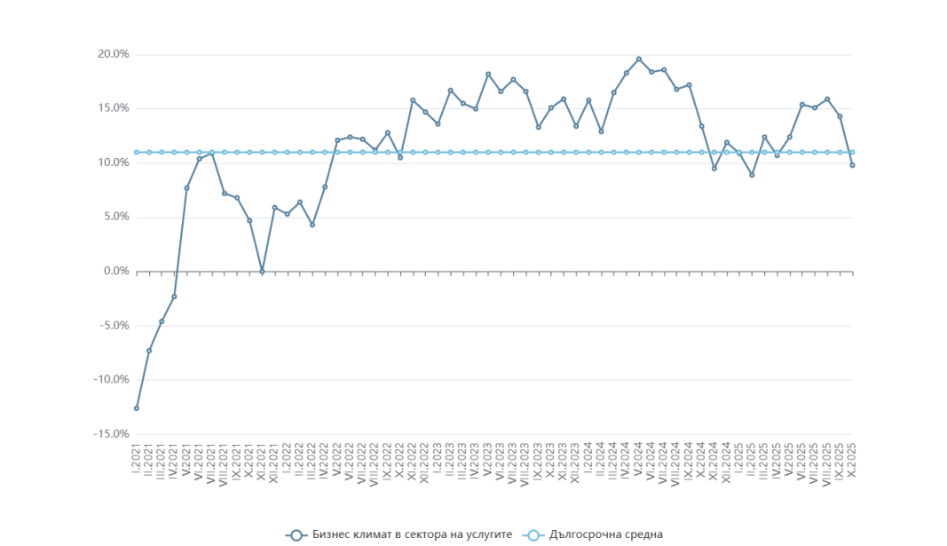 Съставният показател "бизнес климат в сектора на услугите" се понижава през октомври с 4,5 пункта до 9,8% от 14,3% през септември в резултат на резервираните оценки и очаквания на мениджърите за бизнес състоянието на предприятията. Неблагоприятни са и мненията им за настоящото търсене на услуги, докато в прогнозите им за следващите три месеца се наблюдава известен песимизъм.