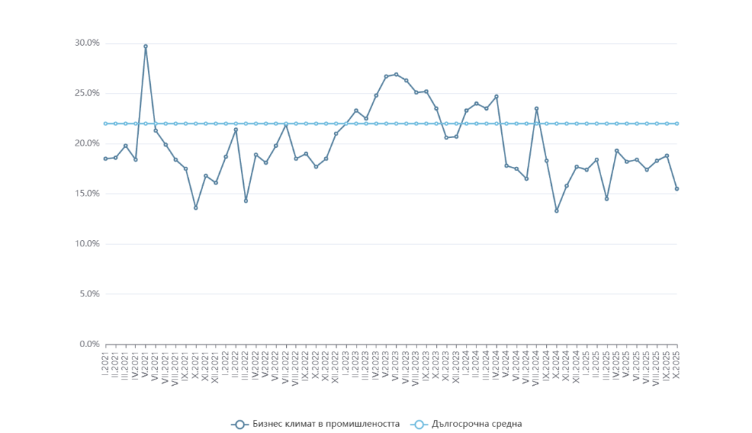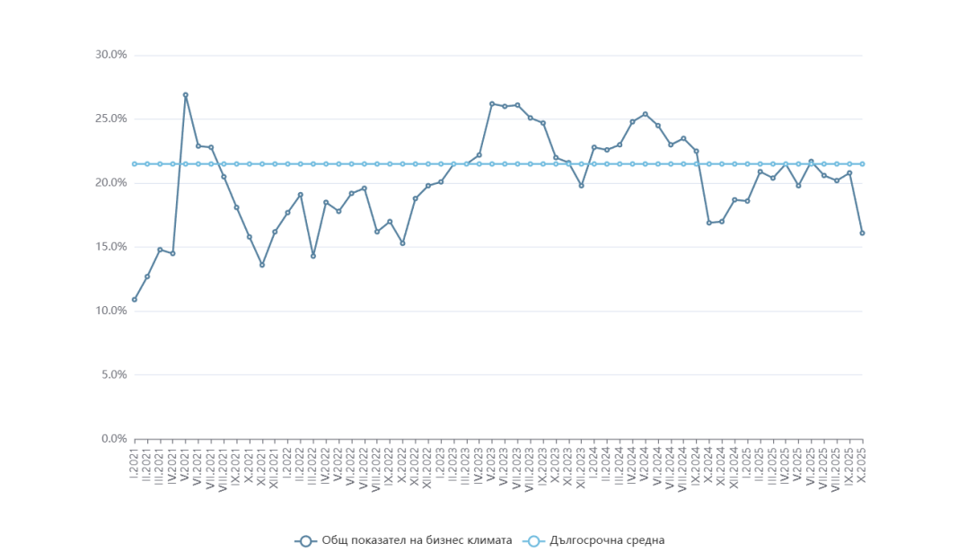 Общият показател на бизнес климата през октомври спадна с цели 4,7 пункта до 16,1% от 20,8% през септември, достигайки най-ниско ниво от октомври 2022 г. и далеч под неговото дългосрочно осреднено ниво към 21,5%.