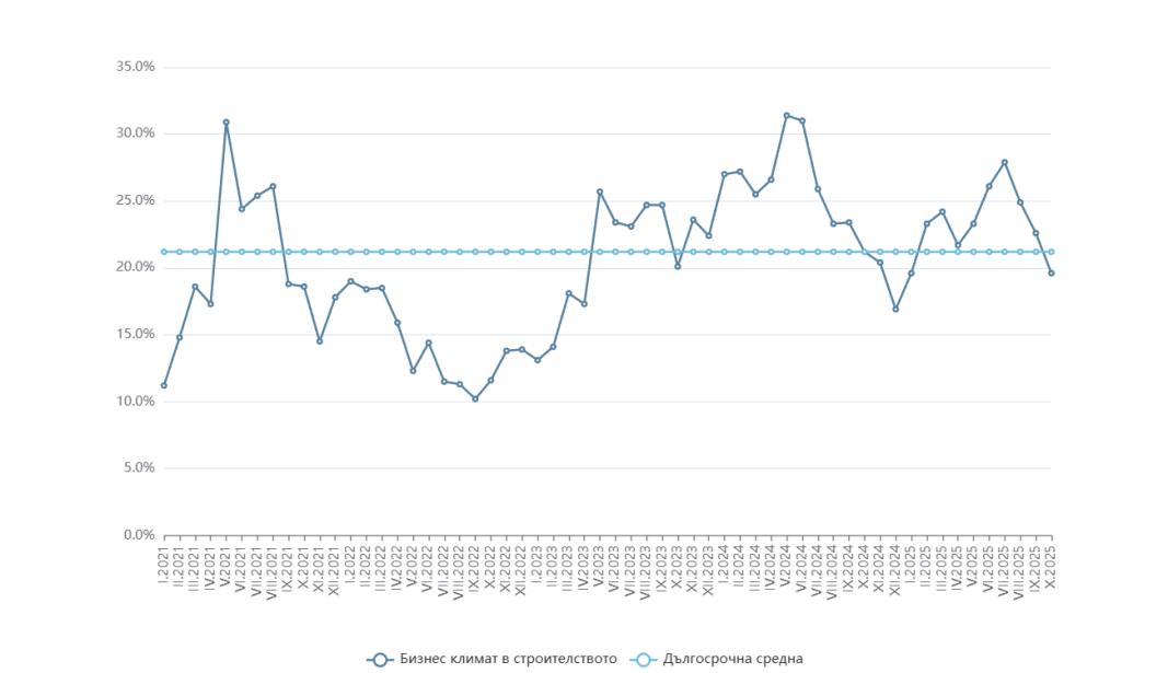 През октомври "бизнес климат в строителството" се понижава с 3,0 пункта, достигайки 19,6% от 22,6% месец по-рано. Понижението е в резултат на влошените оценки и очаквания на строителните предприемачи за бизнес състоянието на предприятията. Според тях в следващата половин година се очаква леко намаление на новите поръчки, което ще доведе и до свиване на дейността в краткосрочен план