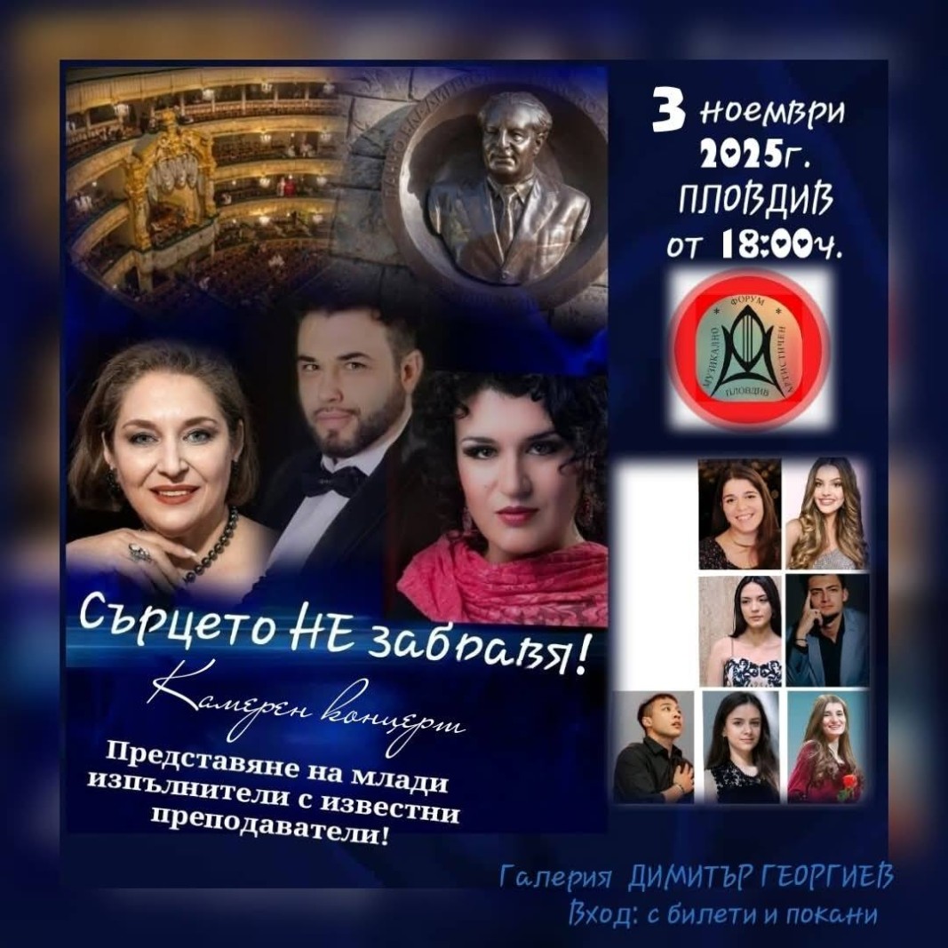 Млади вокални таланти ще изнесат класически концерт в галерия "Димитър Георгиев" в Пловдив. Те ще изпълнят прочути произведения на композитори като Белини, Верди, Пучини и Чайковски. Концертът е организиран от "Музикално-артистичен форум", създаден от онкохирурга Ваня Балева.