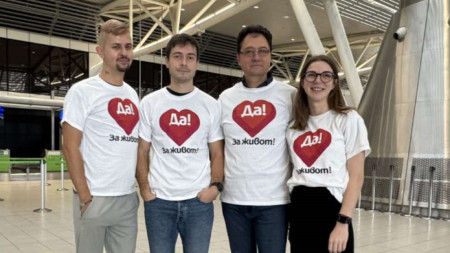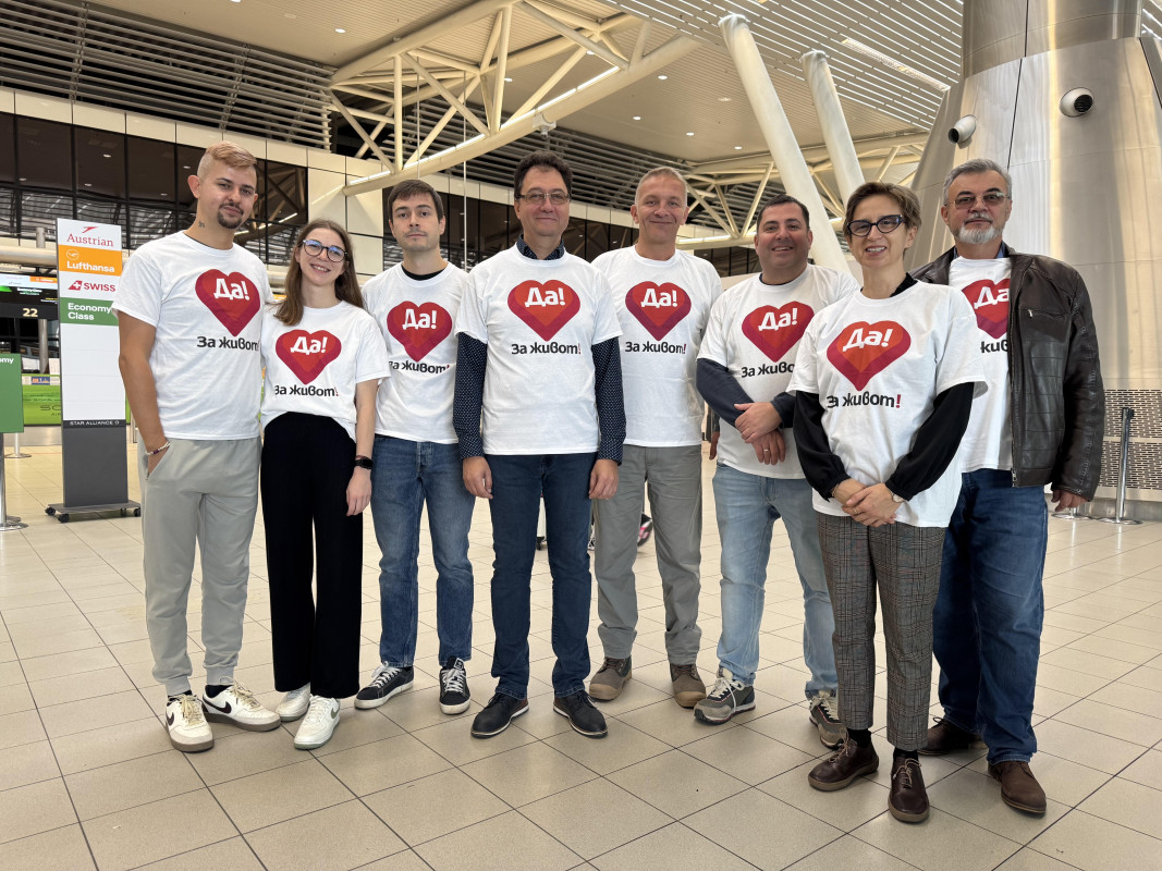 Част от групата облече тениски Да. За живот - Кампания в подкрепа на донорството и трансплантацията, за да подкрепят каузата преди полета!