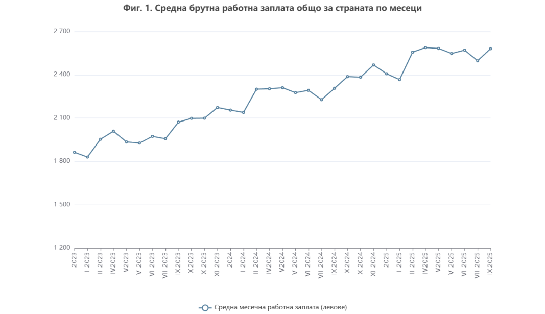 През третото тримесечие на 2025 г. средната работна заплата общо за страната достига 2549 лева, като нараства с 12% спрямо същото тримесечие на преходната година, но отбелязва спад от 0,9 процента спрямо второто тримесечие на настоящата.