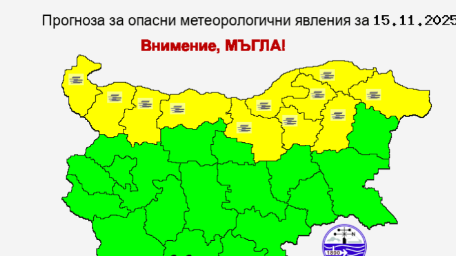Обявен е жълт код в 11 области на Северна България заради мъгли.