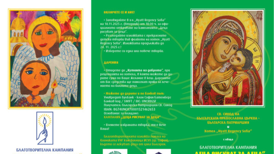 На 18 ноември 2025 г. от 18:00 ч ще се състои Благотворителната изложба "Деца рисуват за деца", организирана от Св. Синод на БПЦ в полза на Детското УНГ отделение на УМБАЛ "Царица Йоанна – ИСУЛ".