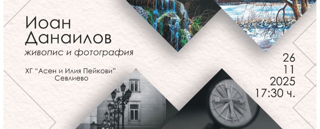 В художествената галерия "Асен и Илия Пейкови" в Севлиево тази вечер ще бъде открита изложбата на младия художник Иоан Данаилов. От 17:30 ч. жителите и гостите на града ще могат да се докоснат до неговите платна и фотографии, които разкриват особеното му усещане за детайл и природа.