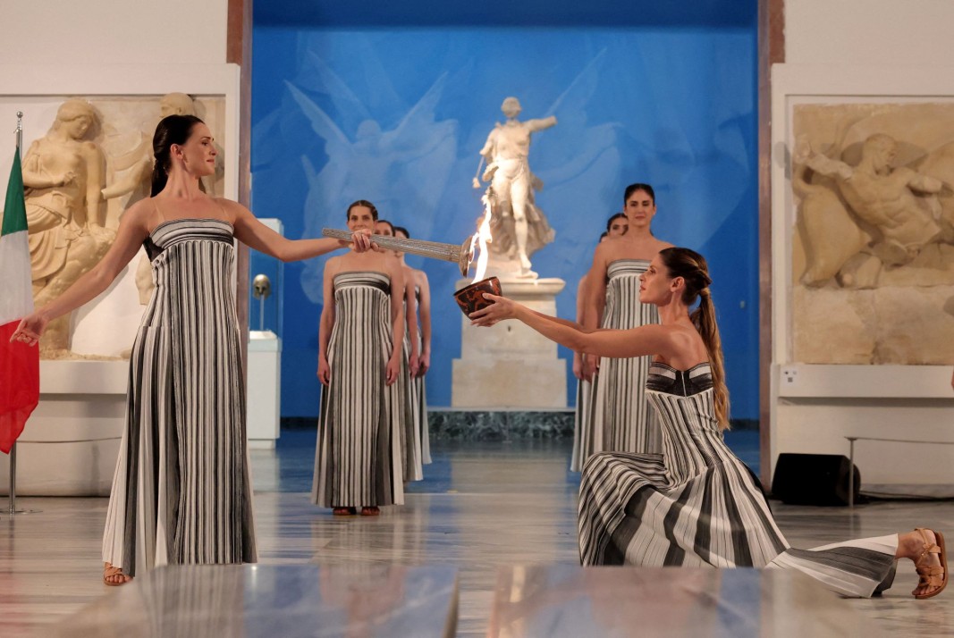 Върховната жрица, изиграна от известната гръцка актриса Мери Мина, предаде пламъка на първия факлоносец Петрос Гайдацис - бронзов медалист в гребането от Олимпийските игри в Париж през 2024 година.