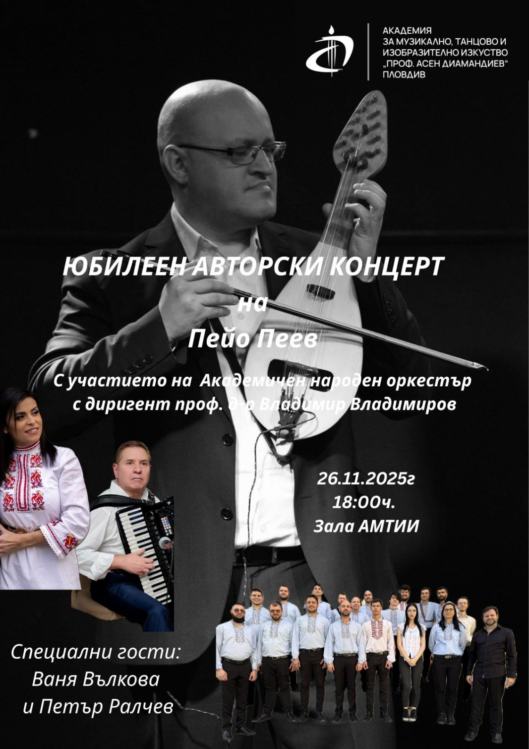 Послучай 50-та си годишнина гъдуларят Пейо Пеев тази вечер ще представи юбилеен авторски концерт в залата на Академията за музикално, танцово и изобразително изкуство. В концерта ще участва Академичния народен оркестър с диригент проф. Владимир Владимиров. Специално са поканени певицата Ваня Вълкова и акордеонистът Петър Ралчев.