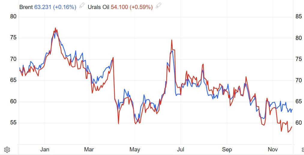 Миналия месец Съединените щати наложиха строги ограничения на руските петролни гиганти "Лукойл" и "Роснефт" и това допринесе за увеличаване на ценовата отстъпка на Уралс спряно петрола сорт Брент.