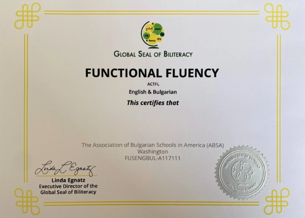 – Тестът по български език, предложен от департамента, впоследствие е одобрен от борда по образование на щата и през 2017 г. Министерството на образованието и науката подкрепя утвърждаването му като валидиращ знанията в Съединените щати. Сключената спогодба утвърждава правото на Департамента за езиково обучение да оценява владеенето на български език на живеещите зад граница ученици и студенти. Дава се възможност и всяко българско училище зад граница да се превърне в своеобразен изпитен център по български език."