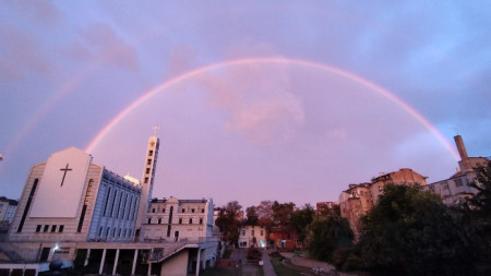 Пъстра дъга се показа над София в петък сутрин и смая бързащите за работа и училище жители на столицата, предава БГНЕС. Голяма и ярка, дъгата се показа преди 8.00 часа, докато над града преваляваше слаб дъжд.