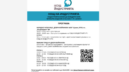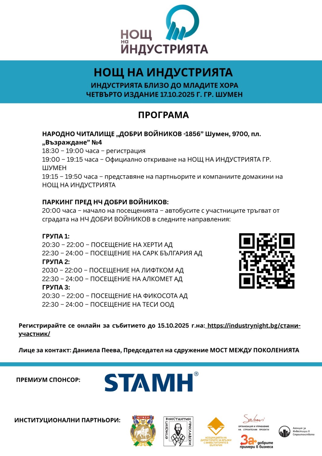 За първи път в Шумен ще се проведе Нощ на индустрията с посланието: "Индустрията близо до младите хора". Инициатор на събитието е Сдружение "Мост между поколенията", което го организира със собствено финансиране и със съдействието на общините по места. След Стара загора, Габрово и Петрич, сега те са подбрали 6 индустриални предприятия в Шумен, които ще отворят вратите си и ще представят дейността си и условията на труд пред младите хора.