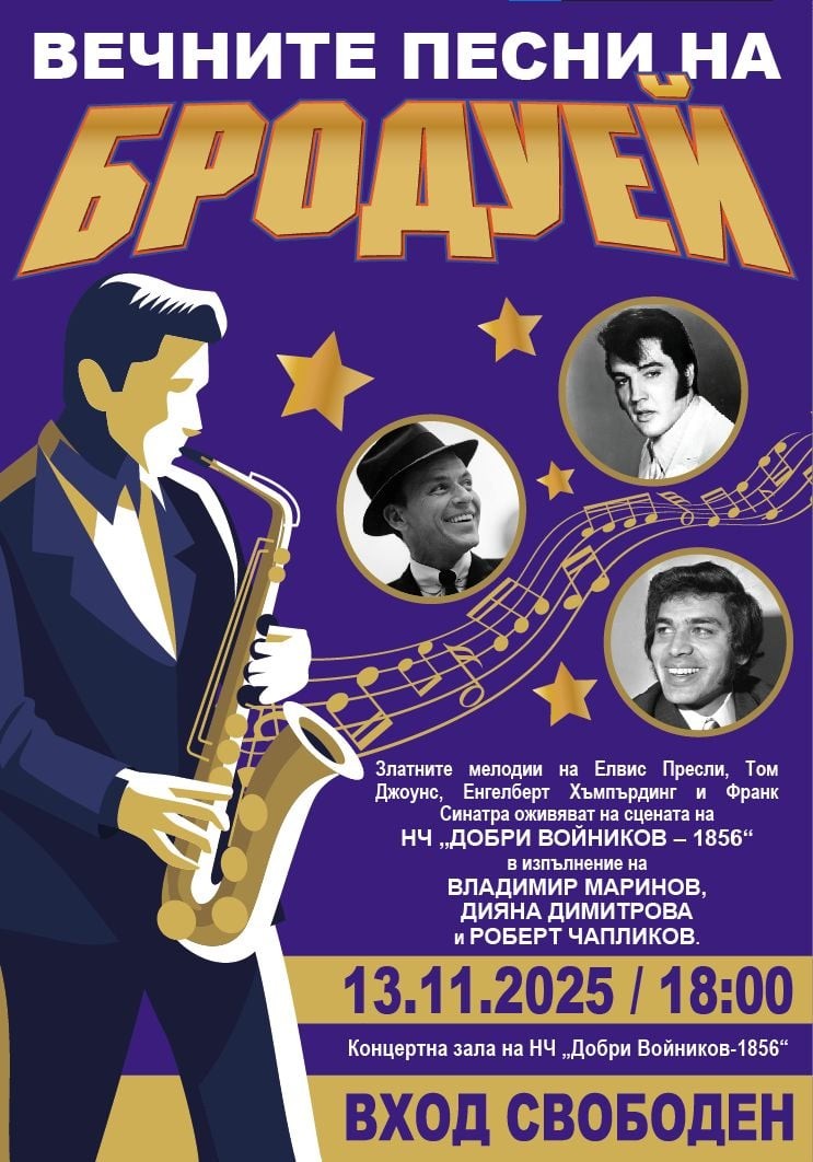 Магията на вечните евъргрийни ще оживее на сцената в концертната зала на НЧ „Добри Войников – 1856“ на 13 ноември (четвъртък) от 18.00 часа.