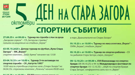 Разнообразна спортна програма очаква всички жители и гости на Стара Загора по повод предстоящия празник на града – 5 октомври. Над 20 спортни събития са включени в празничния календар и ще се проведат с подкрепата на Община Стара Загора. Ето и подробна..